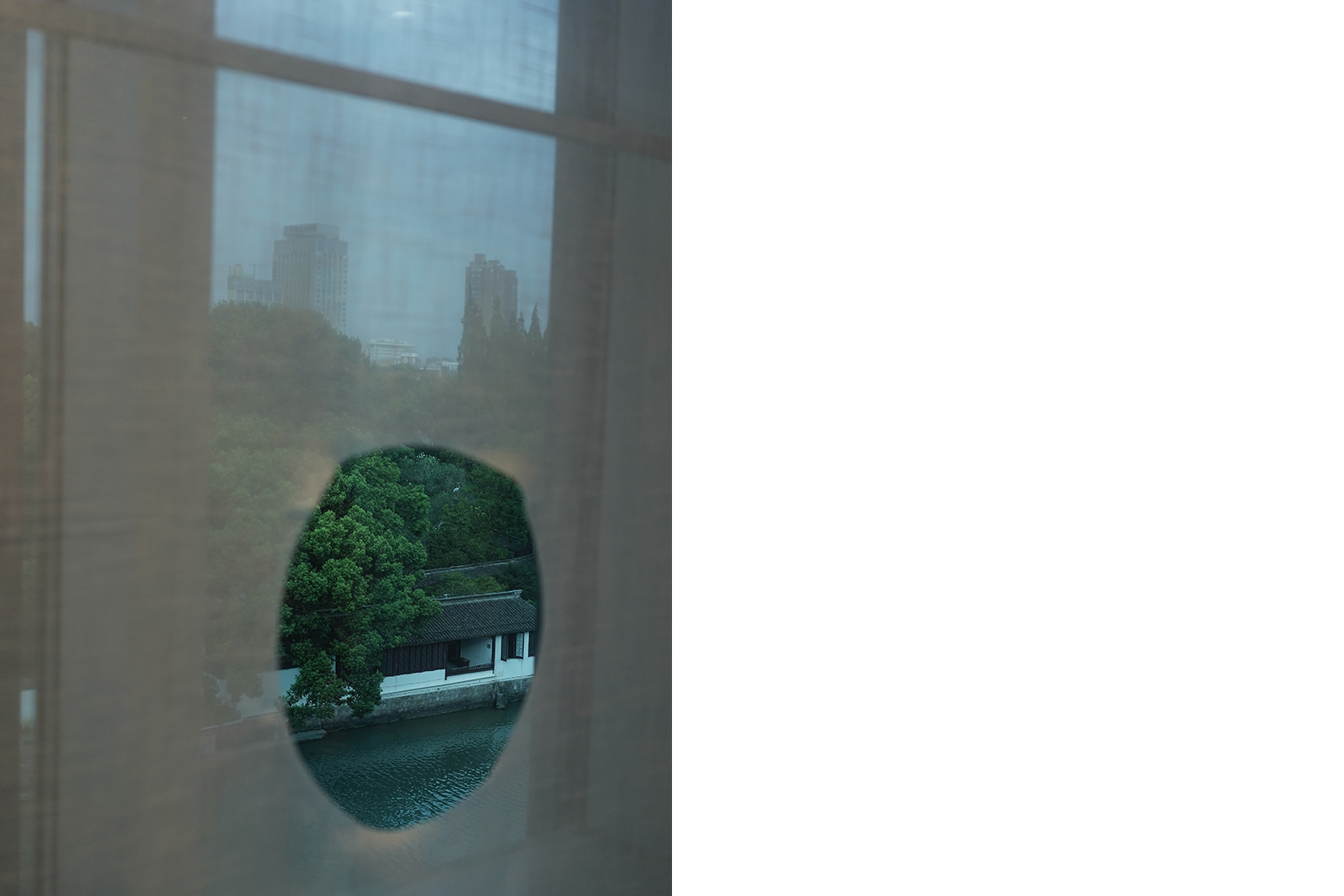 The exhibition hall is situated on the fourth floor of Yunjian Hall in Songjiang, covering an area of 170 square meters. The longer northern side faces the southwestern corner of Zuibai Pond, offering a window view filled with lush greenery that transitions distinctly through the four seasons. Overlooking the corridors, pavilions, and waterside structures creates a sensation of being among the clouds.